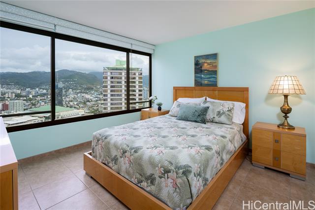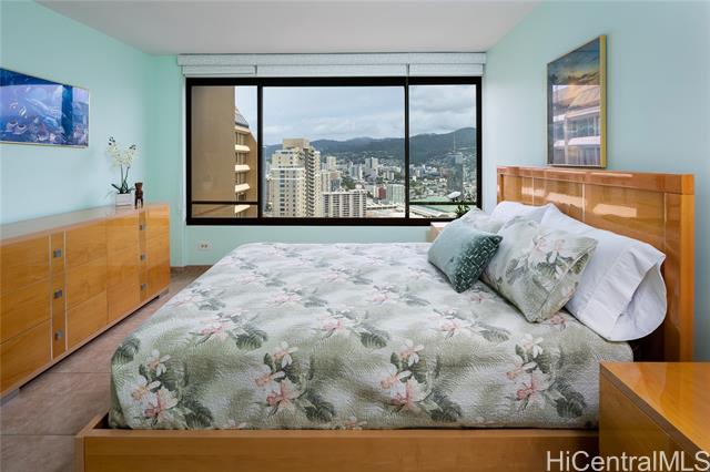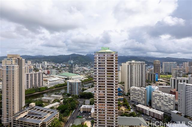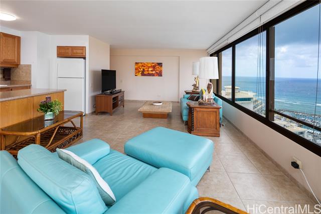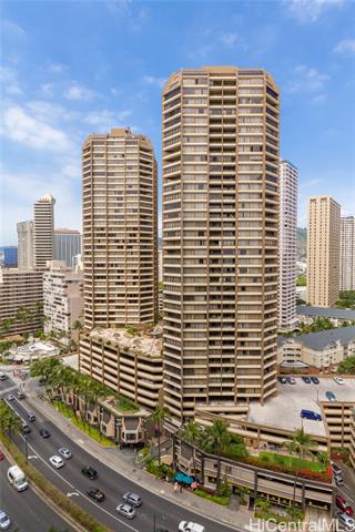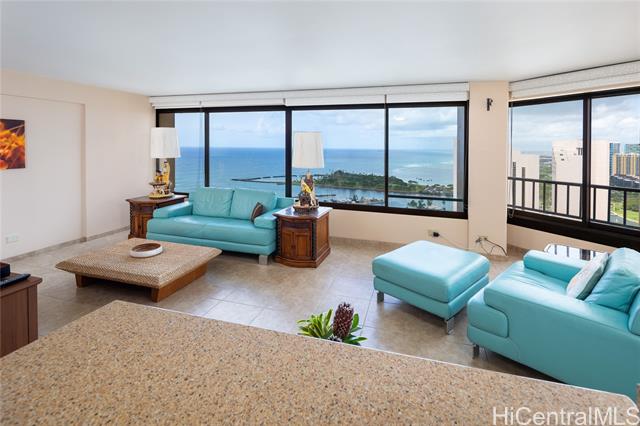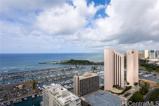 - Panoramic Ocean View in this rarely available unit in the 19 stack--40th floor corner unit, Resolution Tower. It's a WOW View at all times of the day or night. Excellent condition. Enclosed lanai makes for a huge living room. The corner unit allows excellent air circulation. Bedroom has great views of the mountains. Lots of storage in the huge closet in the bedroom hallway, plus another closet in the living room hallway. Kitchen has lots of cooking items plus dishes and glasses. Bosch front loader washer and dryer. Parking stall on the 6th floor near the elevators. Many amenities in this complex such as pool and whirlpool, fitness center, BBQs and sauna. Beaches and Magic Island are close by, along with Ala Moana Shopping Center, easy bus service, and restaurants. 96.893% of the fee has been purchased. Only 3.107% left. Lease rent is paid quarterly at $41.09 per quarter. Unit is being sold AS IS. Easy to see. Vacant. Seller wishes to have Kevin Batungbacal for escrow at First American Title, Aina Haina.